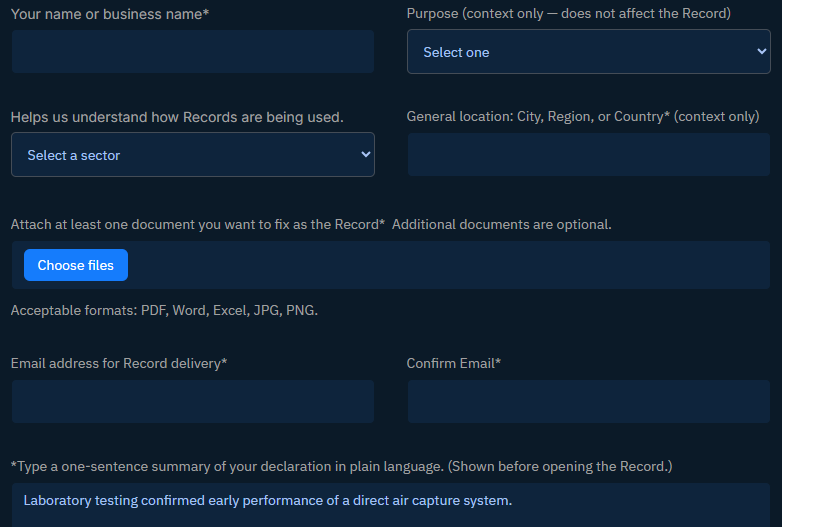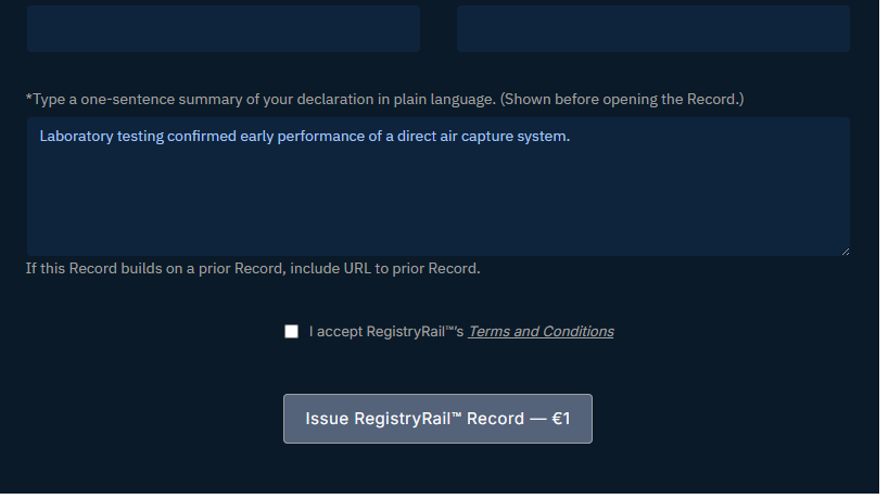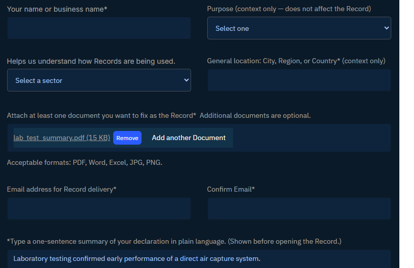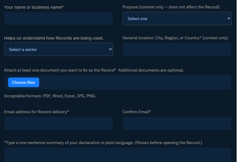A RegistryRail Record captures the authoritative version of what was declared, and when.Control of sharing and visibility remains exclusively with the creator.